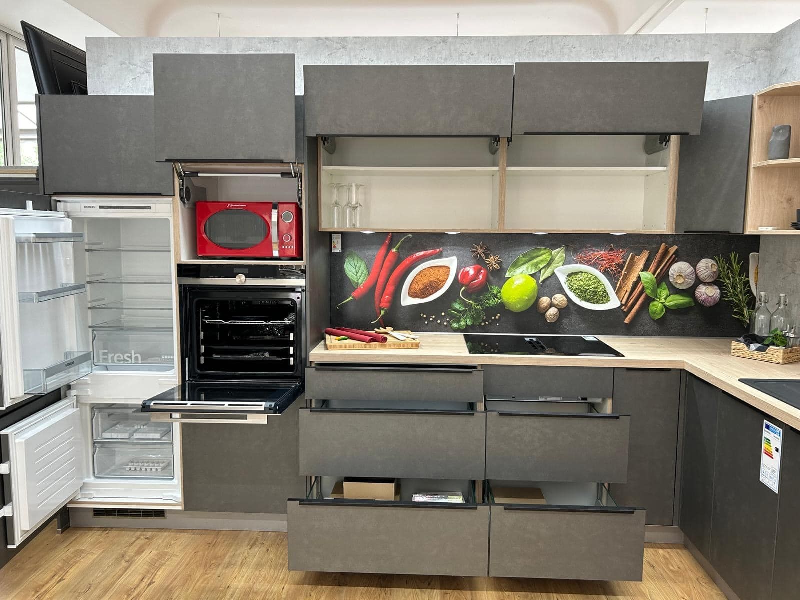 - Nischenrückwand: Modernes Gewürzmotiv in stilvollen Farben, das der Küche eine persönliche Note verleiht und gleichzeitig als praktischer Spritzschutz dient.