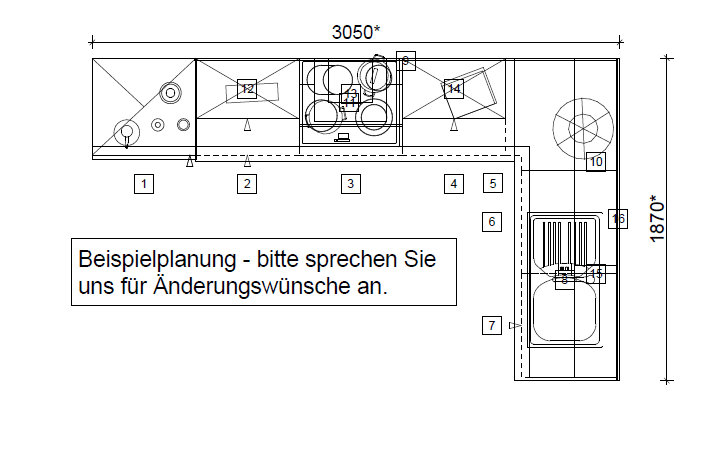 Diese Küche ist eine Beispielplanung, die den Grundstein für Ihre individuellen Küchenwünsche legt. Passen Sie die Küche Ihren Vorstellungen an und nutzen Sie die vielfältigen Erweiterungsoptionen, um Ihren persönlichen Kochtraum wahr werden zu lassen.